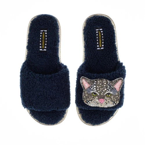 Teddy Towelling Slipper Sliders With Luna Cat Brooch