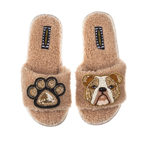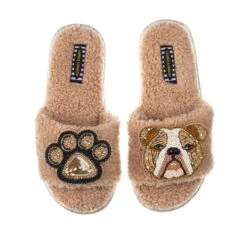 Teddy Towelling Slipper Sliders With Mr Beefy & Paw Brooches