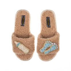 Teddy Towelling Slipper Sliders With New Baby Boy Brooches