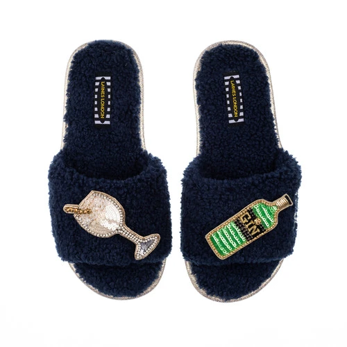 Teddy Towelling Slipper Sliders With Original Gin Brooches