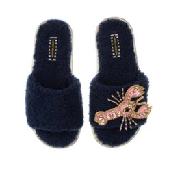 Teddy Towelling Slipper Sliders With Pink & Gold Lobster Brooch