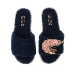 Teddy Towelling Slipper Sliders With Pink & Gold Prawn Brooch
