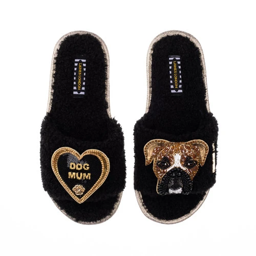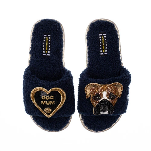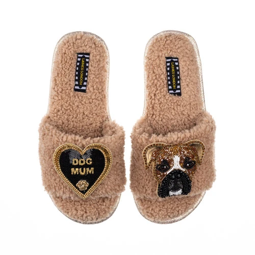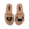 Teddy Towelling Slipper Sliders With Pip & Dog Mum Brooches