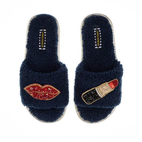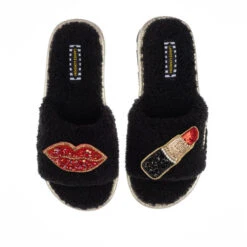 Teddy Towelling Slipper Sliders With Red Pucker Up Brooches