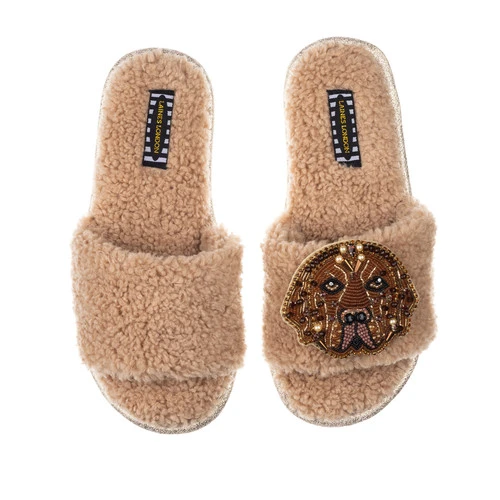 Teddy Towelling Slipper Sliders With Rocco The Chocolate Lab Brooch