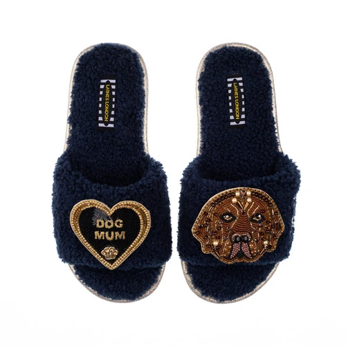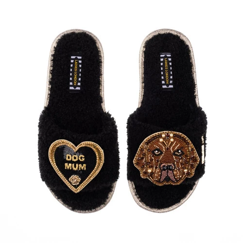 Teddy Towelling Slipper Sliders With Rocco The Chocolate Lab & Dog Mum Brooches