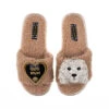 Teddy Towelling Slipper Sliders With Skip The Golden Lab Brooch