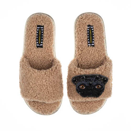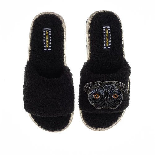 Teddy Towelling Slipper Sliders With Snoopy The Black Pug Brooch