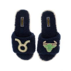 Teddy Towelling Slipper Sliders With Taurus Star Sign Brooches