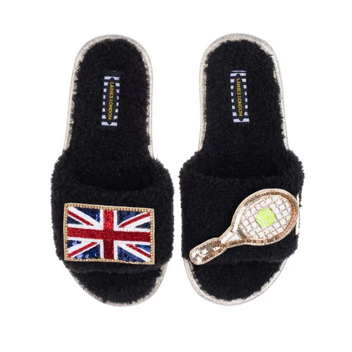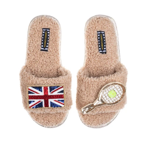 Teddy Towelling Slipper Sliders With Tennis & Union Jack Brooches